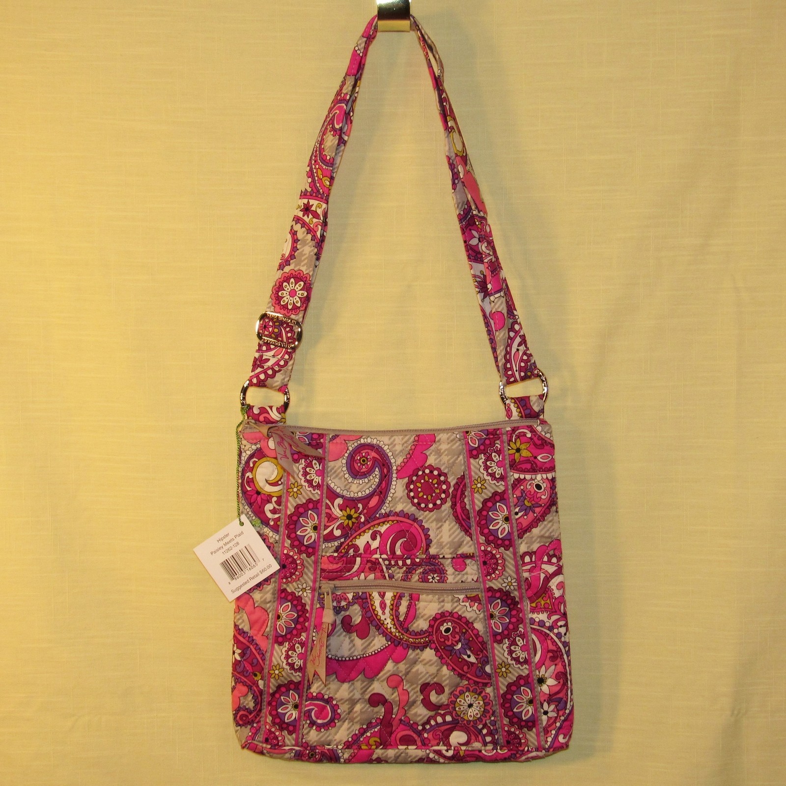 Thisconvenient purse can be worncross-body and has azipper closure across the top. The bag is made ofcotton and the inside pattern coordinates with the outside. There are2 pockets on the outside of the purse front -1 slip and1 zip, as well as1 zip pocket across the back.