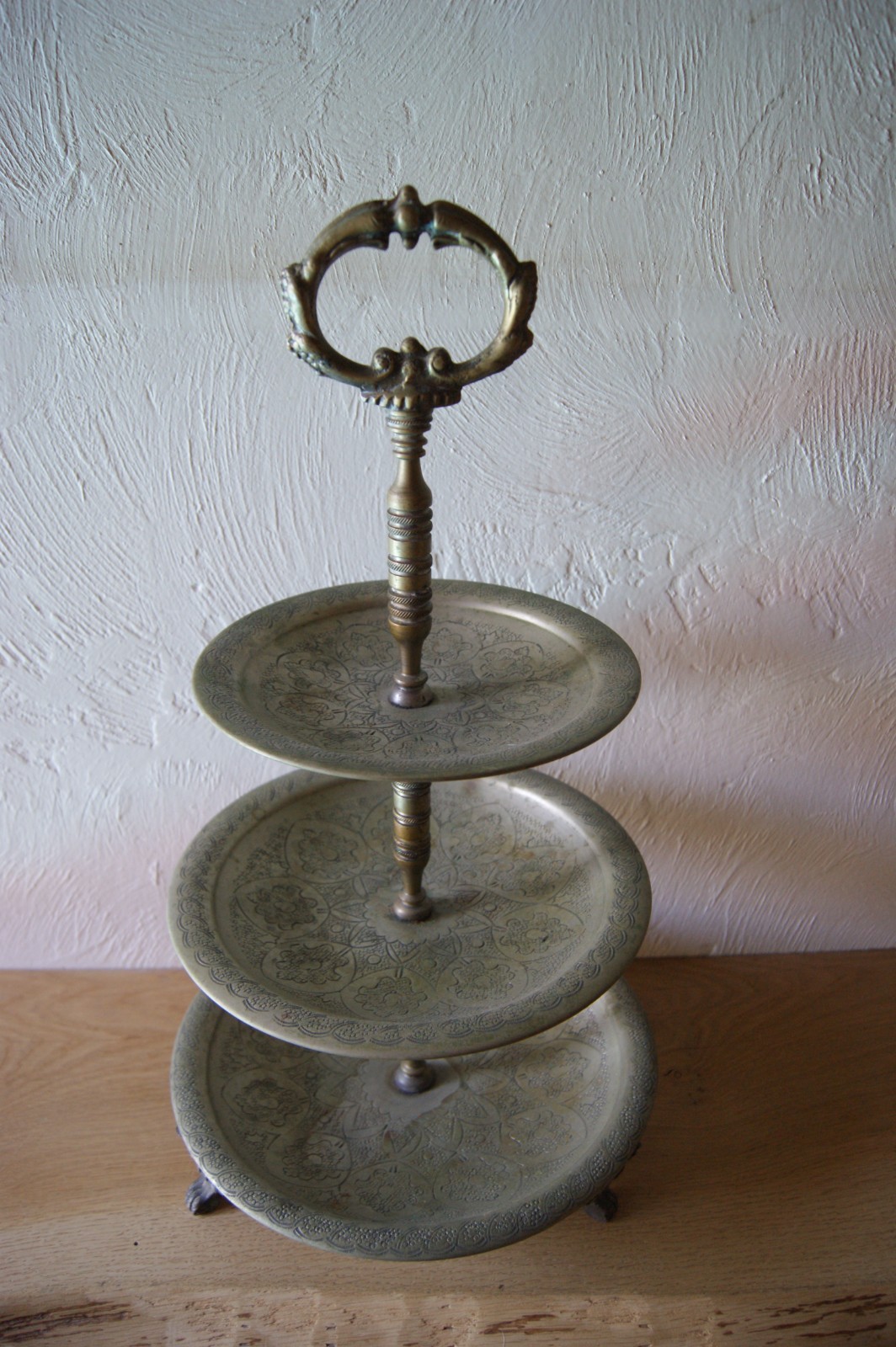 Hauteur: 50 cm. Diamètre des plateaux: 19, 23 et 26 cm.