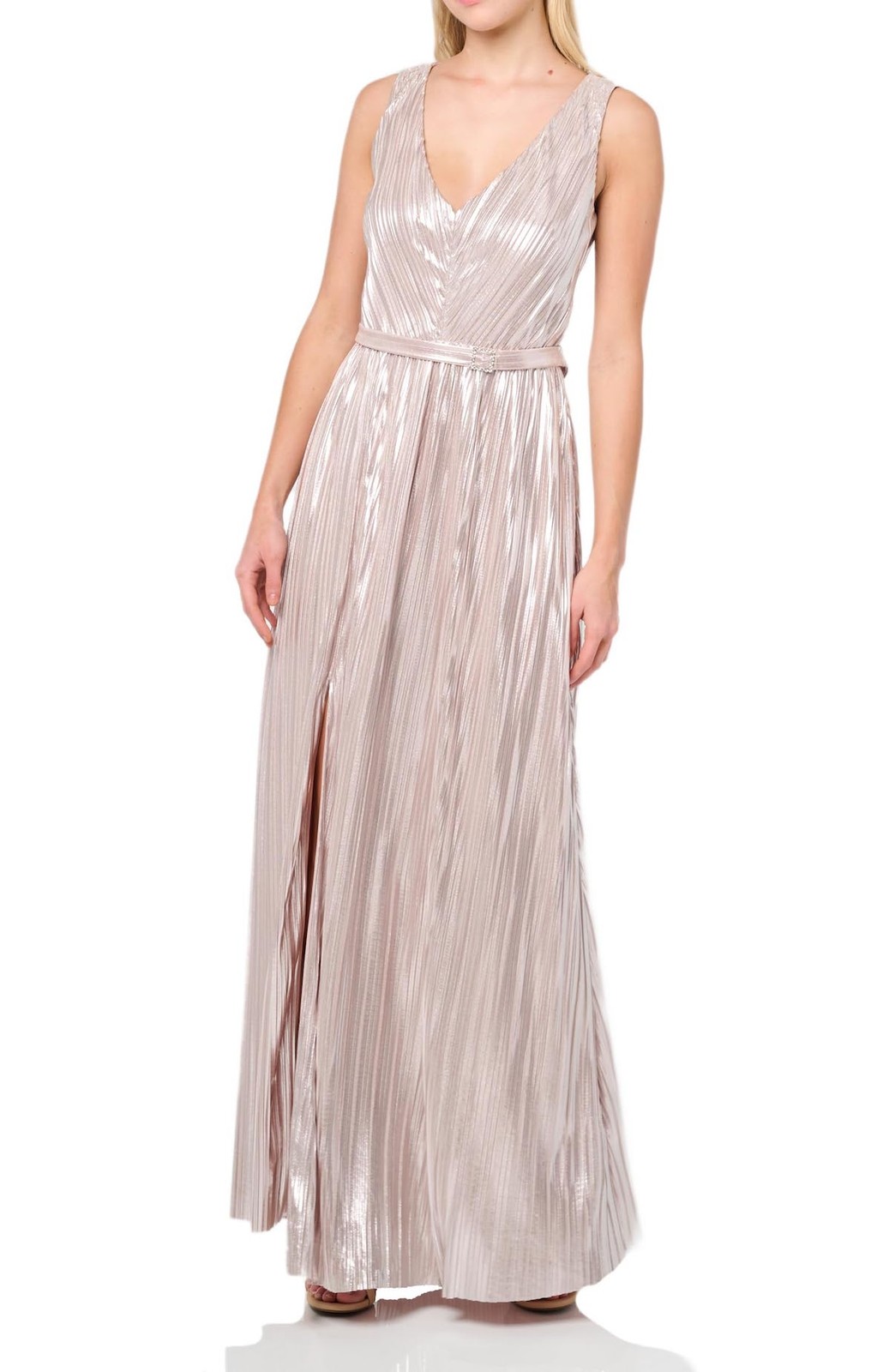 Eliza J EJ2-9578 Metallic Stripes Belted VNeck Sleeveless Slit Gown SZ 8 Blush