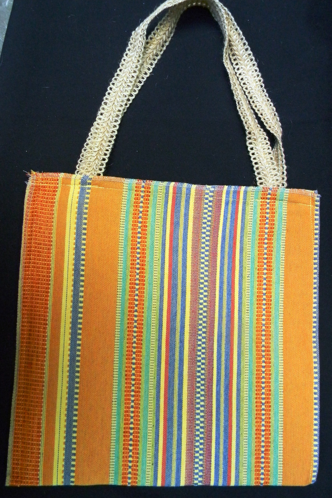 Handmade multi-color vertical stripes tapestry/woven fabric tote w decorative jute handles - NEW. Edges stitched in a contrasting light beige that coordinates with the jute handles. Reinforced between the inner and outer layers to add structure and durability.
