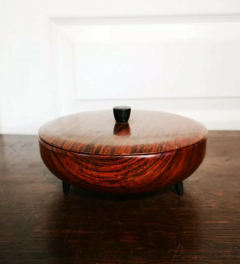 Vintage Ancien Très Jolie Bonbonnière Boîte ronde avec couvercle En Tôle Marron Sur 3 Pieds Diamètre : 18 cm Hauteur : ~7 cm Bon état général Voir les photos pour l'état et le descriptif de l'objet. Plus de renseignements par messagerie. Les frais d'envoi à l'international concernent l'Europe et la Suisse. Pour une autre destination, me demander les frais de port avant. Merci