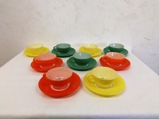 9 tasses à café en céramique, faïence, décor nappe, vert, vintage années 70