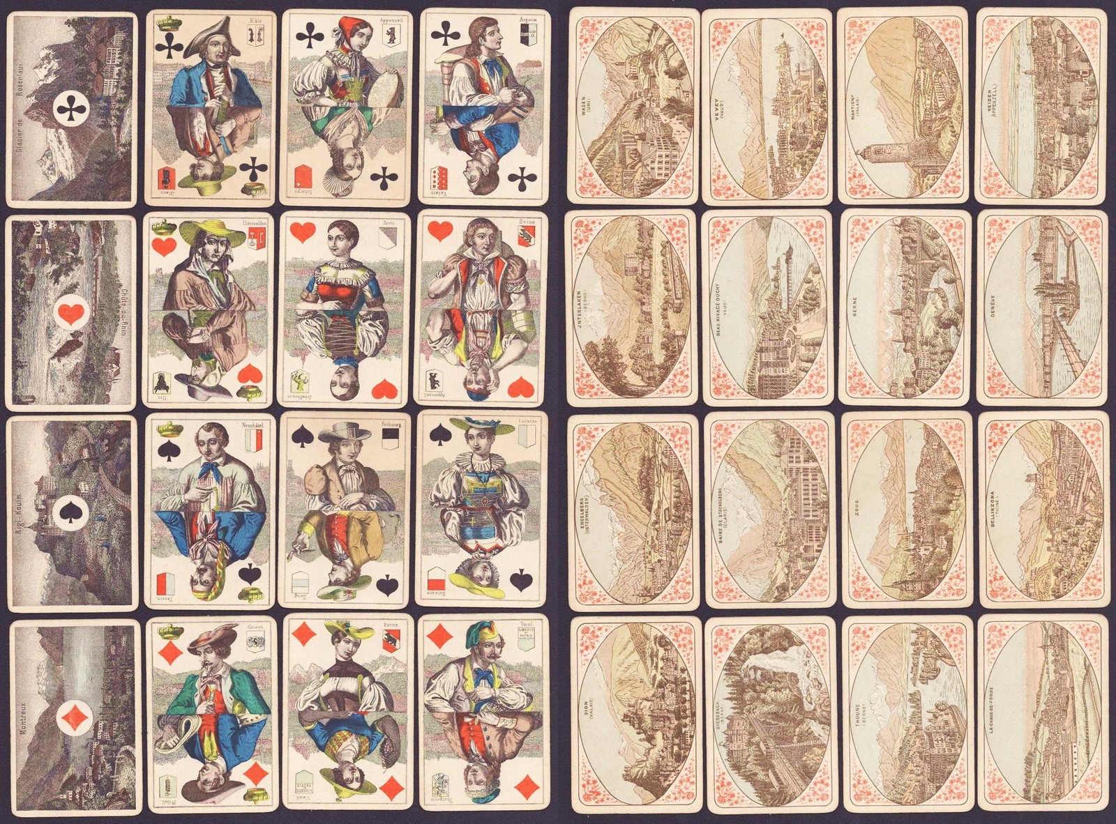 Schaffhouse, Jean Müller ca. 1890. Cartes à jouer 52/52 (lithographie), avec emballage d'origine. Dimensions : env. 85x60mm -- Tous les dos avec des motifs différents. -- Emballage présentant de petites déchirures en partie restaurées et légèrement usagées, sinon bon état. || 52/52 cartes à jouer lithographiques. Avec étui d'origine. -- Toutes les cartes avec diverses illustrations au verso. -- étui présentant quelques petites déchirures (en partie restaurées) et présentant quelques traces d'usure, sinon très bon état.Numéro de commande : 301194.