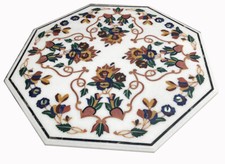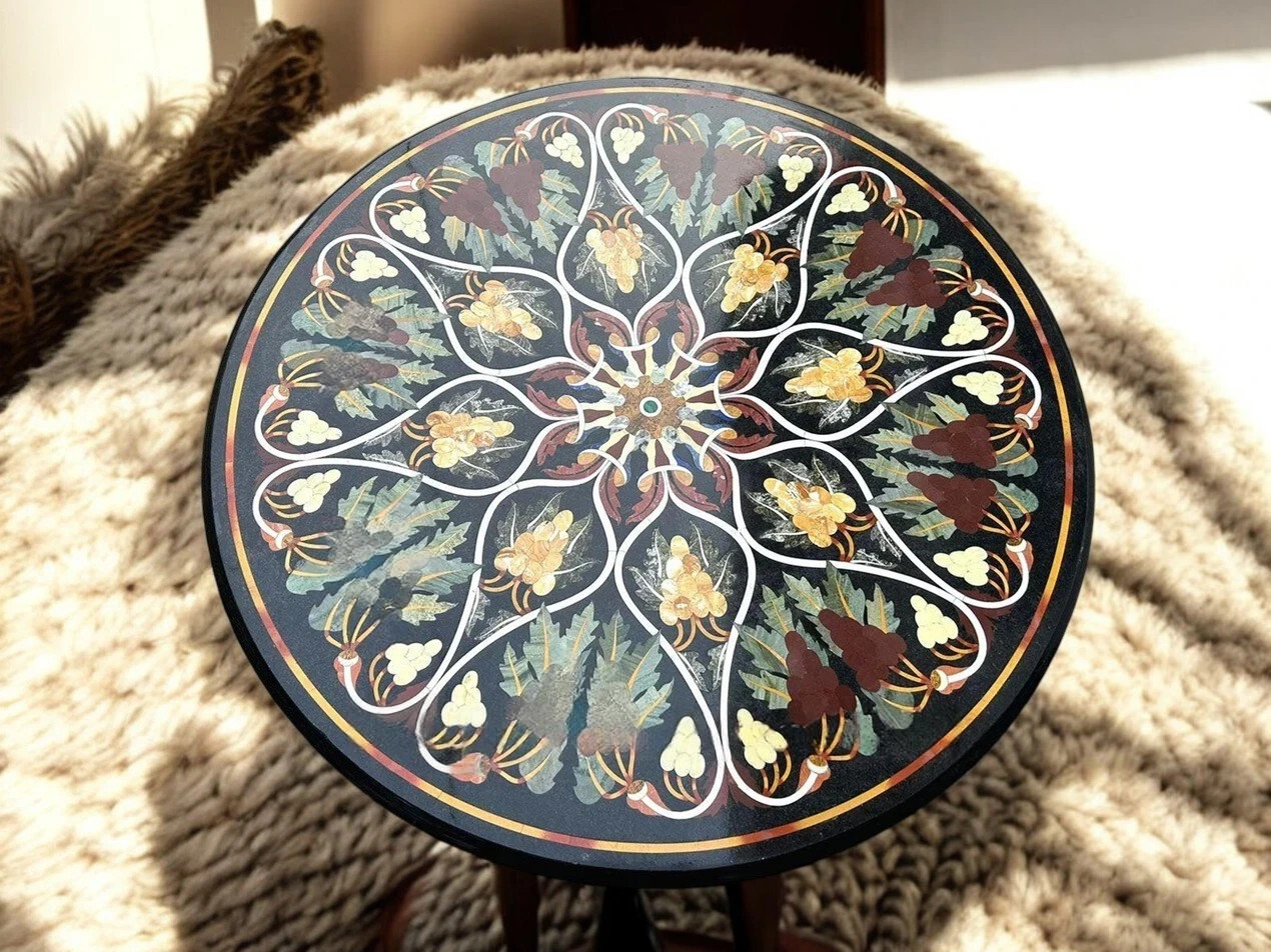 Pietra Dura, qui signifie « pierre dure », est une forme d'art de la mosaïque développée à Florence, en Italie, et perfectionnée par des artisans moghols en Inde, notamment dans le Taj Mahal. Il s’agit de couper et d’assembler avec précision des pierres colorées hautement polies pour créer des images complexes. Chaque pièce individuelle de pierre semi-précieuse est taillée, façonnée à la main, puis habilement incrustée dans la surface du marbre, créant ainsi un design homogène, vibrant et incroyablement durable. Contrairement aux articles produits en série, chaque plateau Pietra Dura est une création unique en son genre, imprégnée de l'esprit et du savoir-faire des maîtres artisans. Les motifs complexes et les couleurs vibrantes des pierres naturelles créent une expérience visuelle fascina.