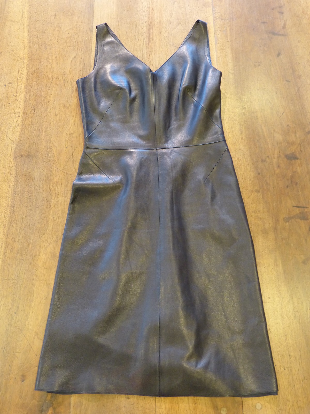 TRES BELLE ROBE EN CUIR TOUT DOUX AGNEAU PLONGE NOIR. Agneau plongé. Taille indiquée 38 qui conviendra à une taille 36 française. 40% bemberg. encolure en V devant et derrière. Doublure : 60% acétate.