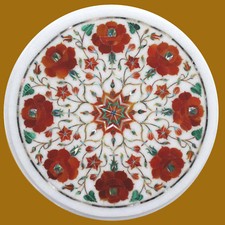 L'effort impliqué dans la fabrication d'une seule fleur peut souvent prendre des jours de travail, selon les détails; Il n'est pas rare d'être conçu à partir de centaines de tranches de pierre différentes. Il existe de nombreuses variétés de pierre colorée disponibles pour l'utilisation dans le travail d'incrustation en marbre: Malachite, Cartonlia, Jasper, mère de Pearl, obalone Shell, Lapis Lazuli, Agnate, Coral, Turquoise et Tiger Eye pour n'en nommer que quelques-uns. Les rainures sont remplies de leurs formes précisément correspondantes de pierre colorée et fixées en place avec un mastic blanc à base d'huile, d'oxyde de plomb et de cire. Une fois que la conception est complètement sèche, la pièce est polie avec un mélange de sable, d'eau et de papier émeri pour donner une finition lis.
