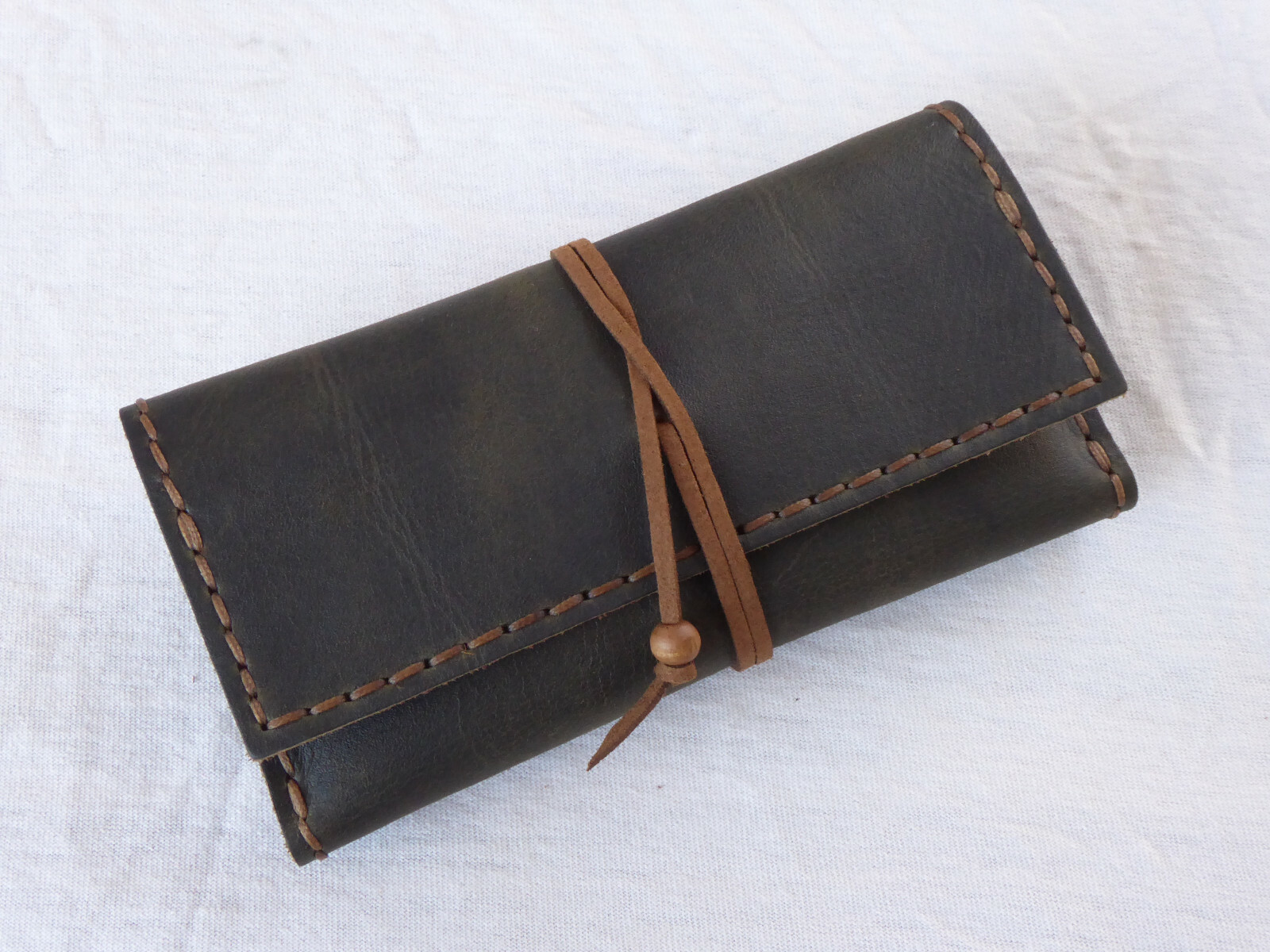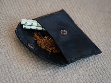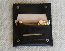 Blague à tabac en cuir 3 volets, confectionnée à la main du début à la fin. Les perles de verre/bois sont facultatives et gratuites. De plus, le fait qu'il se plie deux fois le rend confortable et petit à transporter mais facile à utiliser une fois ouvert.