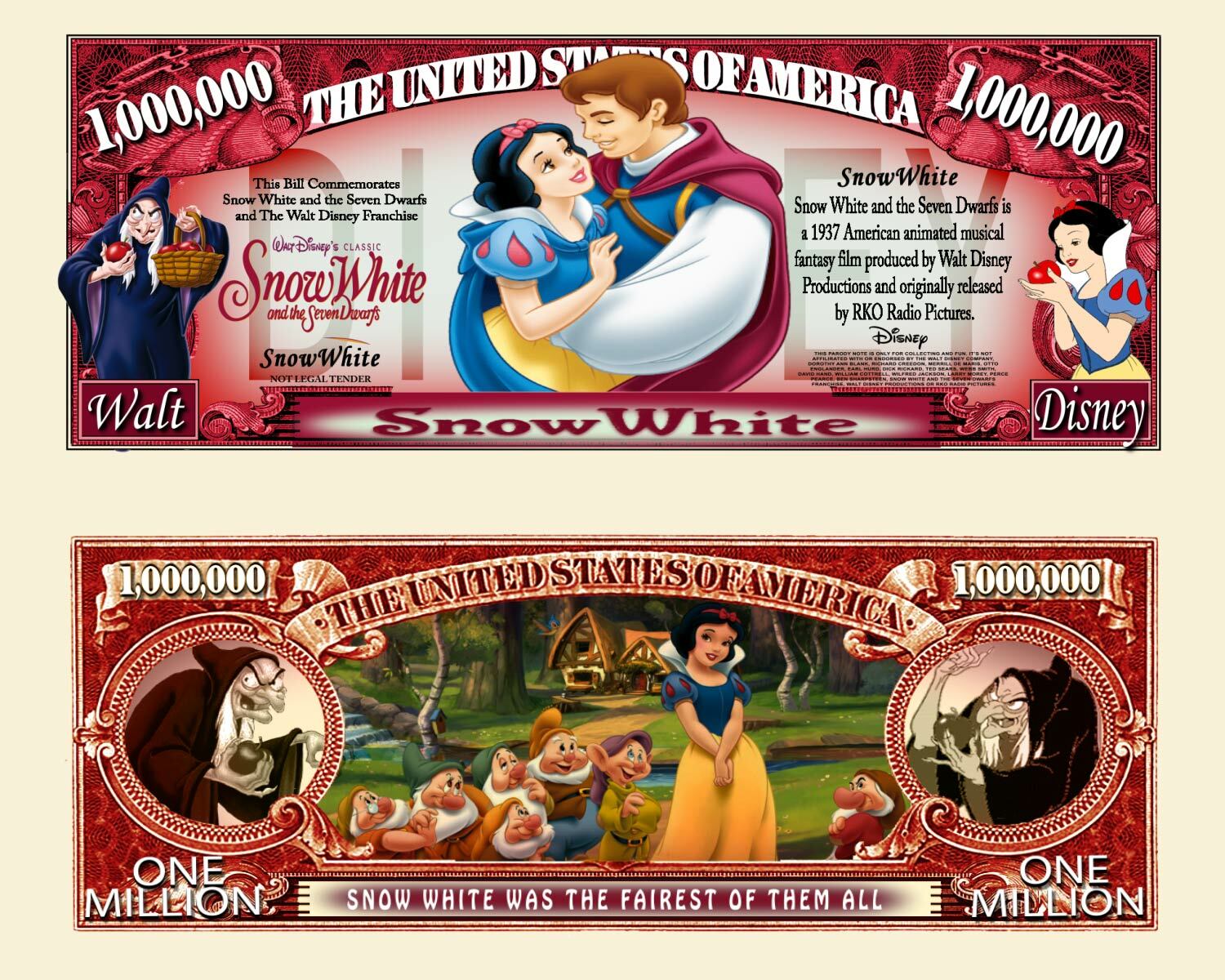 BLANCHE NEIGE ET LES 7 NAINS BILLET MILLION DOLLAR US ! Dessin animé Walt Disney