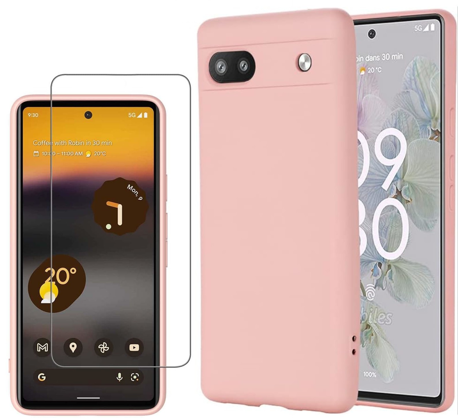 Compatible avec Google Pixel 6A (écran 6,1 pouces). Pack Coque arrière en silicone souple Rose + Protection Ecran Verre avec Lingette nettoyante.