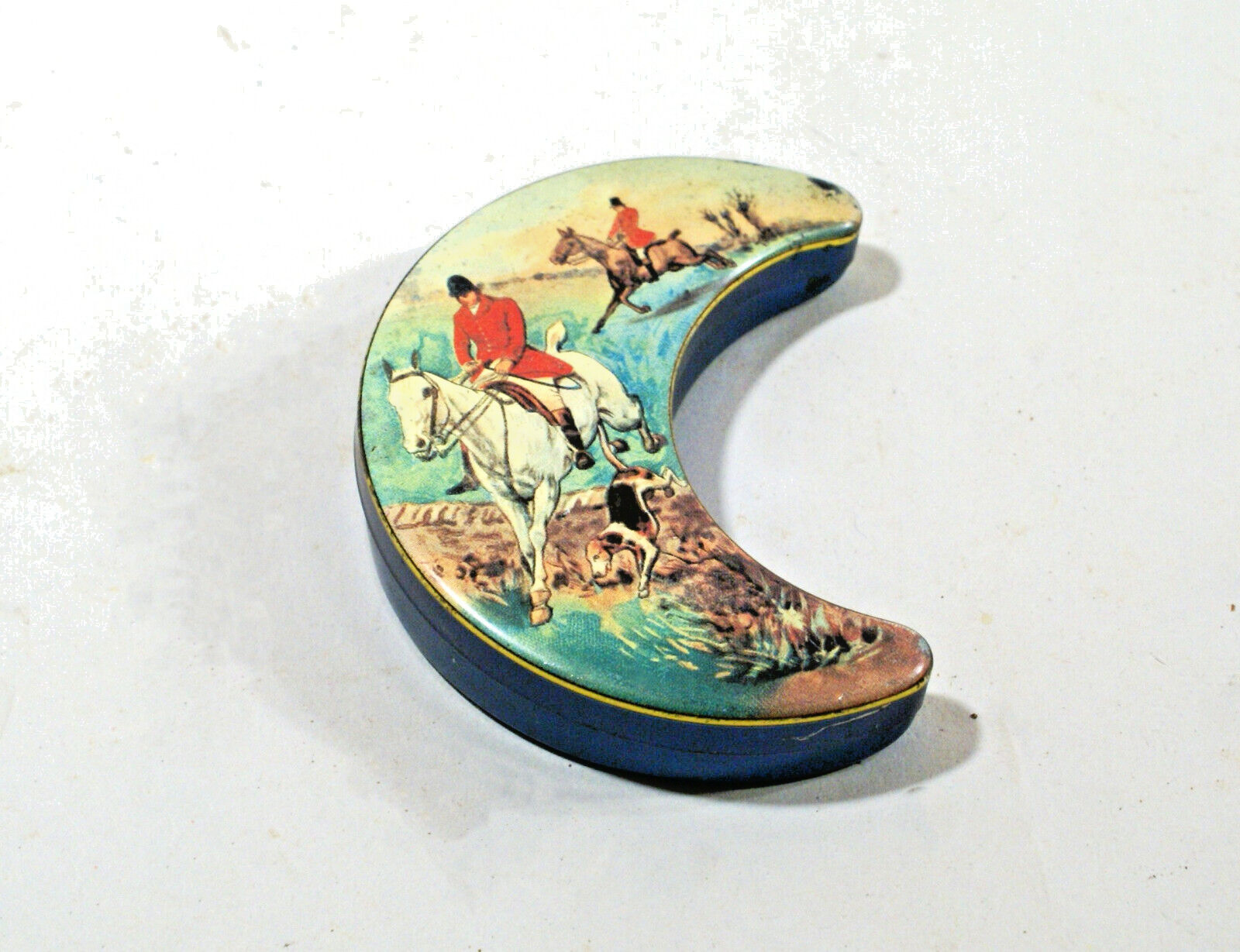 PETITE BOITE ANCIENNE EN FER BLANC, Lackerli-Huus, cheval, cavalier, chien