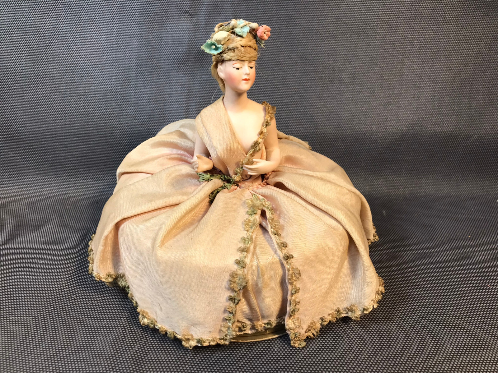 Ancienne bonbonnière avec poupée en porcelaine robe en tissu début 20ème