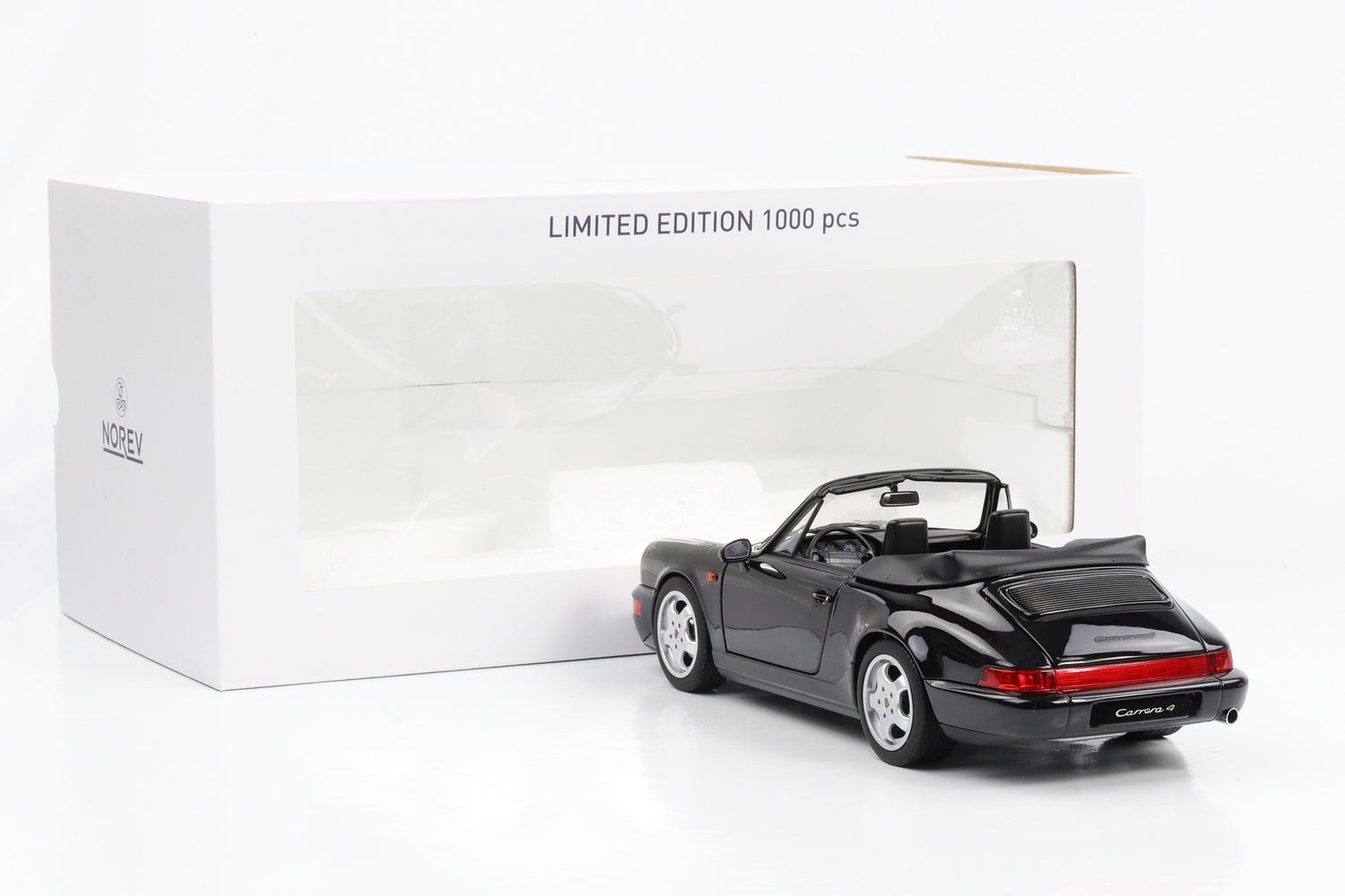 1:18 Porsche 911 964 Carrera 4 Cabriolet noir métallisé 1991 Norev 187332 ouverture complète.