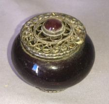 Avec 1 tête de chat sur le couvercle. Très jolie petite boîte dorée à pilules. Excellent état.