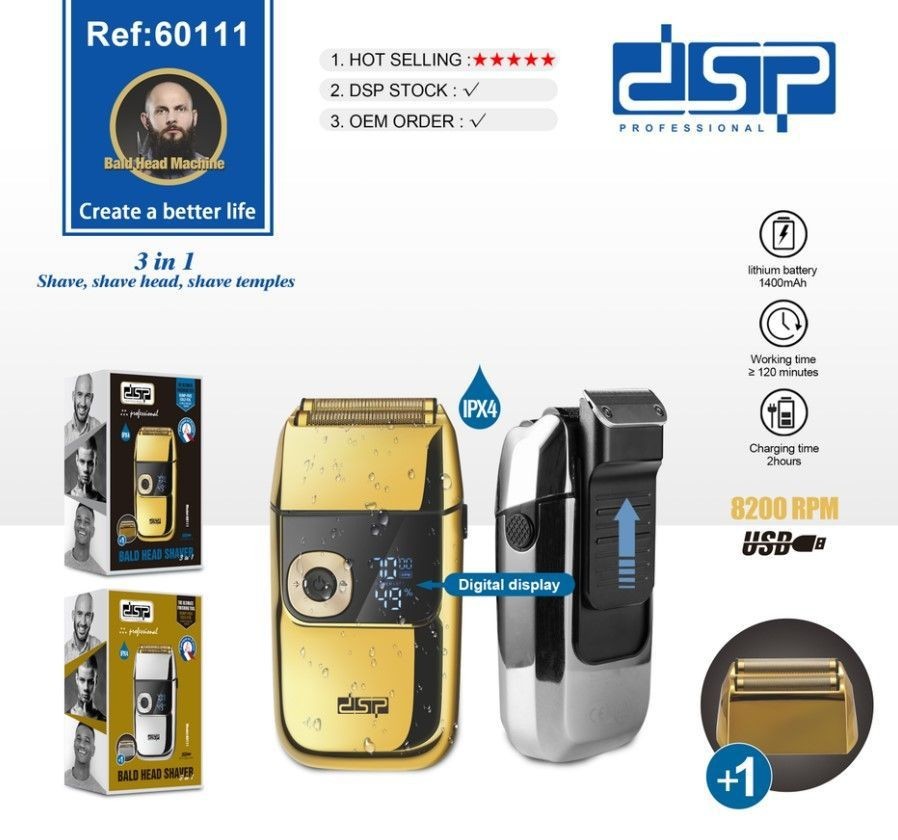 Rasoir électrique DSP 3-en-1 modèle 60111 avec tête multifonction pour le rasage à sec, la tonte et la coupe des cheveux, motorisé à 8200 RPM pour des résultats rapides et précis. Design moderne de couleur or ou argent avec affichage numérique indiquant le niveau de batterie, étanche IPX4 pour une utilisation polyvalente. Batterie au lithium 1400 mAh avec autonomie jusqu'à 120 minutes et recharge complète en 2 heures environ via câble USB. Tête rotative ou en aluminium adaptable pour un rasage en douceur du visage, du cou et des zones sensibles sans irritation. Idéal pour une routine de toilettage quotidienne complète, parfait pour ceux qui recherchent un seul outil multifonction pour la maison ou les voyages. L'étanchéité IPX4 permet un nettoyage rapide sous l'eau, tandis que le moteur à.