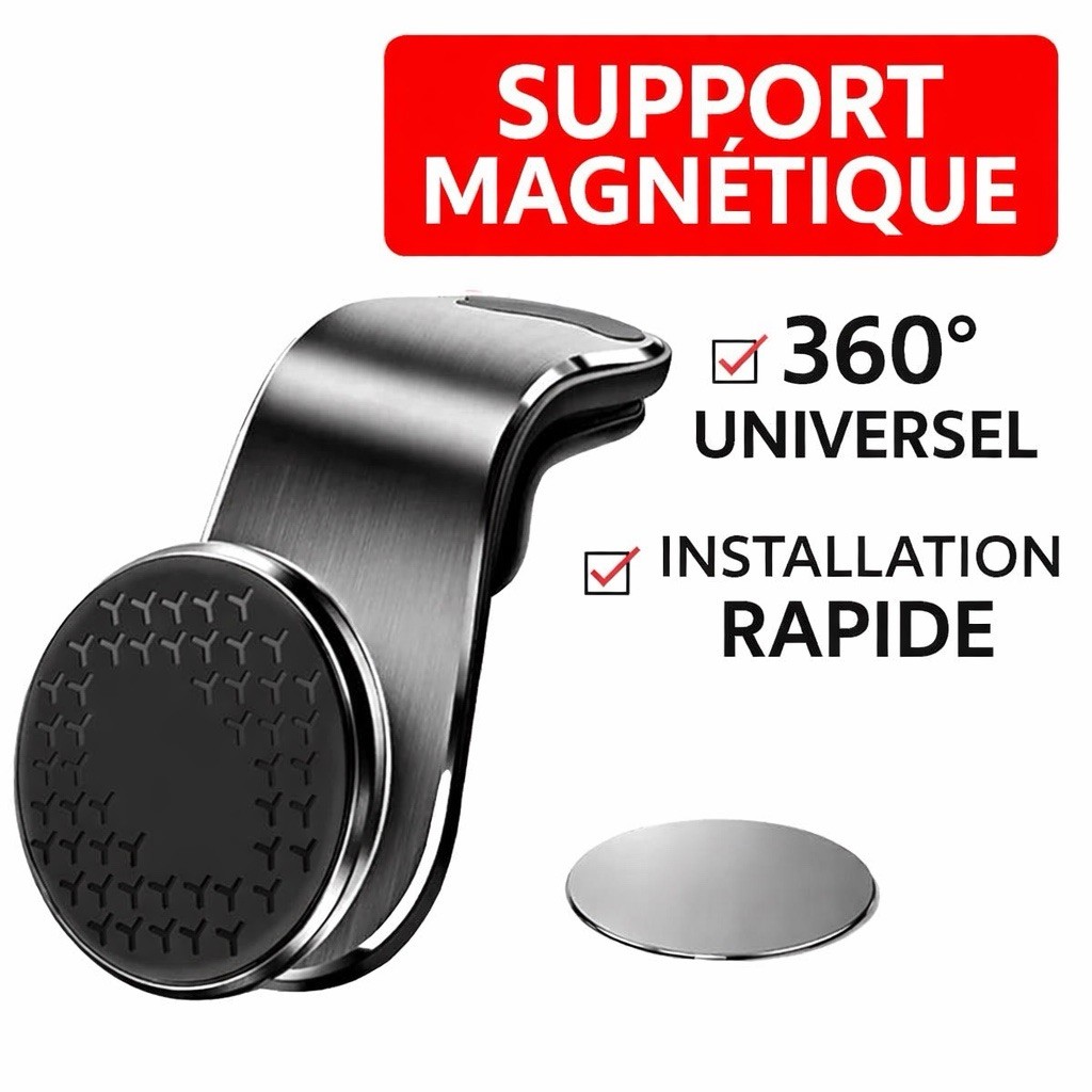 Support magnétique voiture universel pour smartphone — fixation ventilation ou tableau de bord. ✔ Compatible iPhone / Samsung / Xiaomi / Huawei ✔ Rotation 360° pour angle parfait ✔ Installation rapide en 2 sec ✔ Idéal GPS & musique en conduite ✔ Livraison rapide