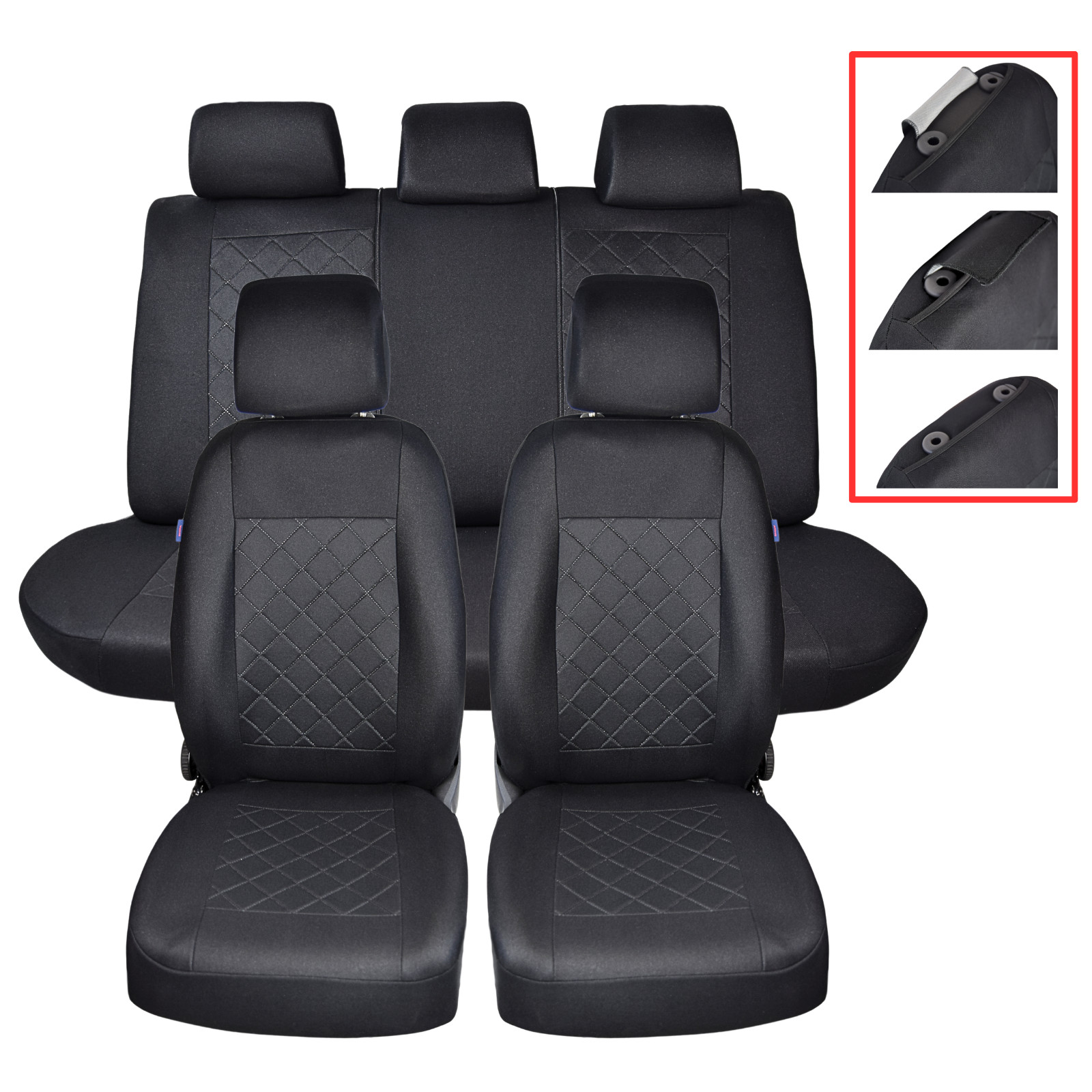 Dans les zones soumises à des contraintes plus importantes et à risque d'usure, un matériau à trois couches est utilisé (mousse renforcée en plus par une doublure en maille). Pour une installation plus facile, les housses sont conçues de telle sorte qu'il n'est pas nécessaire de démonter les appuie-tête des sièges avant et arrière lors de leur installation. Sur certains modèles de véhicules, il peut être nécessaire de prévoir des ouvertures techniques, par ex. Par ex. pour les ceintures qui viennent directement du dossier de la banquette arrière. Toutes les ouvertures nécessaires doivent être découpées indépendamment après que les couvercles ont été fixés et ajustés avec précision (voir instructions de montage). Les housses des sièges arrière (dossier et assise) sont équipées de fermetures.