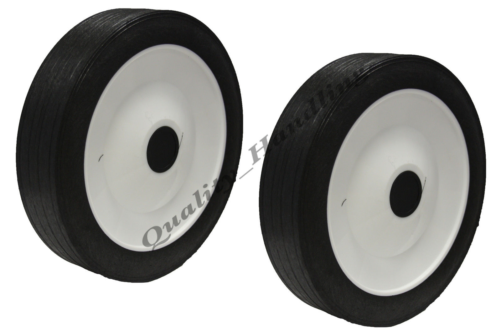 Pneu en caoutchouc solide 200mm x 45mm. Ce sont des roues de tondeuse à gazon d'excellente qualité. Diamètre total : 200mm. Le capuchon de moyeu en plastique est fourni avec la roue. Max load: 100kg chaque roue.