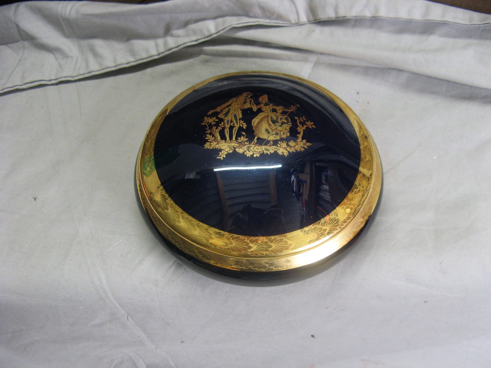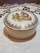 Très belle bonbonnière ancienne en porcelaine de Limoges, issue de la manufacture Bardet, active entre 1946 et 1973. 🔹 Décor : fond bleu de Sèvres, bordure dorée et scène centrale sur le couvercle dans un style rococo.