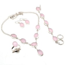 Carefullyfait main et plaqué avec925 sterling silver, cet ensemble comprend unbague, une paire de boucles d'oreilles et un pendentif, tous avec la lueur rose douce et apaisante du quartz rose. Parfait pour un usage quotidien, des occasions spéciales ou des cadeaux.