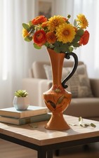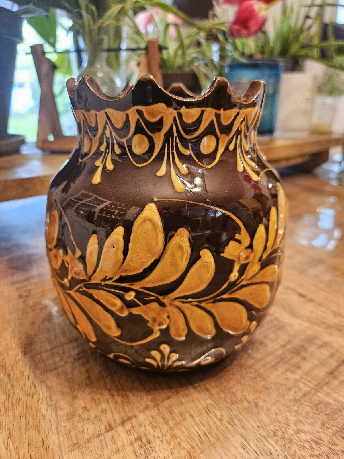 Vase Rustique Céramique Émaillé Brun Et Jaune Vintage Fait Main Signé Sur...
