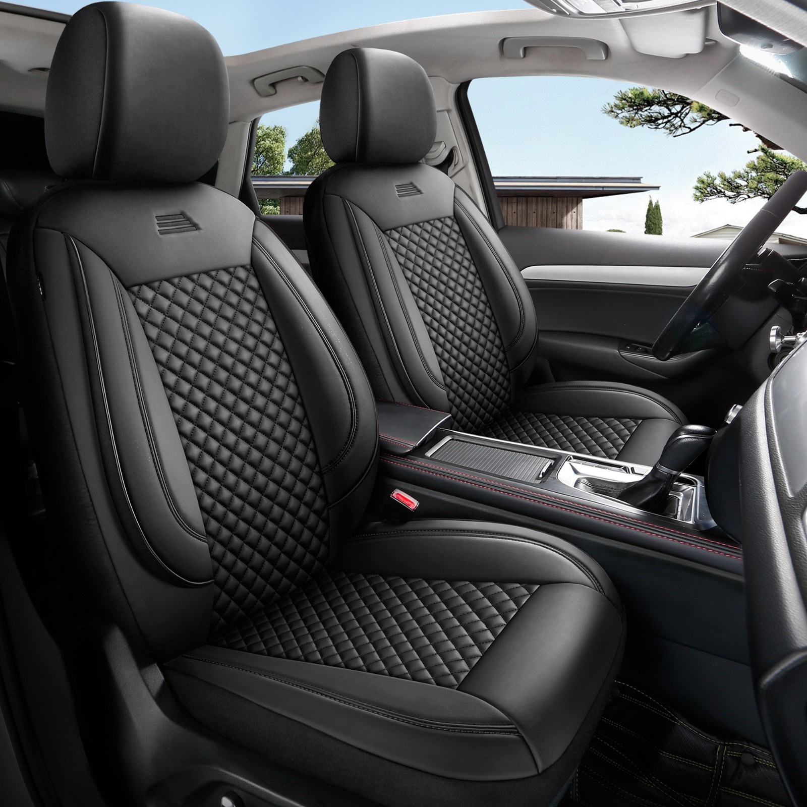 Housses de siège auto AIM Premium - variantes. Housses de siège auto AIM Premium - Coutures noires/rouges, coutures noires/bleues, coutures noires/blanches, coutures noires/noires et similicuir noir.