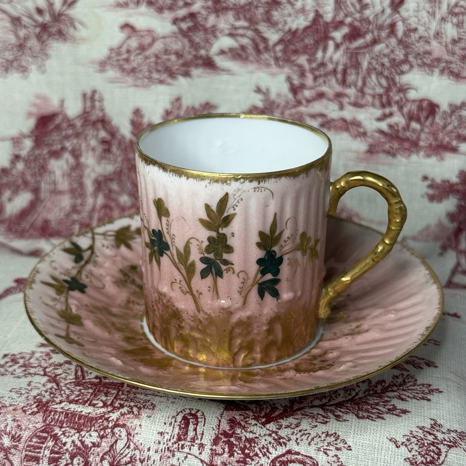 Tasse et soucoupe anciennes en porcelaine française, décor floral rose et or