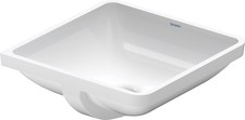 Duravit Starck 3 lavabo à encastrer 0305430000 blanc Conçu par Philippe Starck pour montage par le bas avec trop-plein en céramique sanitaire sans banque de trous de coulée Forme de piscine rectangulaire Y compris fixation pour installation dans des consoles en bois en option pour dalles en pierre naturelle (en supplément) Dimensions intérieures 430x430mm Dimensions (LxPxH)465x465x185mm