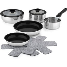 De savoureuses recettes sautées à la poêle ou gratinées au four, c'est la promesse de ESSENTIELB et sa batterie de cuisine de 10 pièces ! L'excellence signée ESSENTIELB Avec leur format rond et leurs diamètres variés, les éléments du set de poêles et casseroles ESSENTIELB mettent entre vos mains deux poêles, deux casseroles et une sauteuse en aluminium solide, résistantes et ultra-performantes. Idéaux pour faire dorer des viandes et pour les cuissons rapides, ces ustensiles en aluminium aux revêtements variés sont les alliés de votre cuisine ! Grâce à un aluminium solide, léger et facile à entretenir, la batterie de cuisine 10 pièces ESSENTIELB délivre une température parfaite en quelques instants et fera le bonheur des chefs amateurs pour toutes vos recettes. Dans un four comme sur une cuisinière, une plaque à induction ou sur un feu classique, votre batterie de cuisine contient une poignée amovible qui s'adapte à tous les récipients. Le plus : un revêtement anti-adhésif céramique assure aux deux poêles et à la sauteuse une cuisson parfaite sans accrocher. Simplicité et intuitivité Un design pointu fait de votre batterie de cuisine une sélection d'ustensiles élégants au look sobre grâce à des finitions inox élégantes, tandis que leur conception en aluminium léger en font des accessoires nobles aux finitions anti-adhésives quelle que soit votre recette. Flexible et adaptable, votre batterie de cuisine fonctionne aussi bien sur des plaques classiques que dans un four, et sa poignée amovible dispose d'une conception en bakélite et inox pour une prise en main hors pair. Matériau ultra résistant et polyvalent, l'aluminium permet une diffusion optimale de la chaleur pour vous aider à réaliser toutes vos recettes en quelques instants. Le plus : avec une conception exclusive signée ESSENTIELB, votre batterie de cuisine dispose de 2 couvercles et s'adapte à tous les feux.