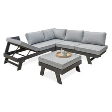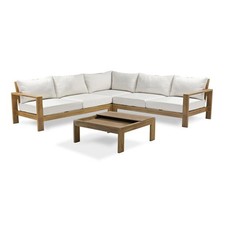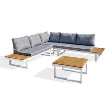 Salon de jardin en bois FSC et corde polyester - Coussins gris chiné - 5 places - Praia • Composition du salon de jardin : 1 table basse ronde, 1 fauteuil d'angle, 2 canapés 2 places • Nombre de places : 5 • Structure : Bois d'acacia FSC avec finition huilée, teinte teck + corde polyester • Pièteme