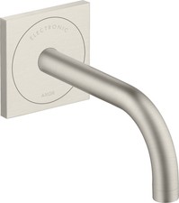 hansgrohe Axor Uno électronique mitigeur lavabo 38119670 Saillie 165 mm jet normal Débit maxi à 3 bar 5 l/min Température réglable via le corps de base Électronique de proximité infrarouge réglage automatique de l'environnement des capteurs infrarouges Portée des capteurs infrarouges réglable (5 réglages) Raccordement secteur 230 V/50 Hz temps de rinçage 10 s Le rinçage hygiénique peut être activé (débit d'eau automatique) Fréquence chasse d'eau 24h Temps de rinçage rinçage hygiénique 10 s Le rinçage continu peut être activé (débit d'eau unique pendant 180 secondes adapté à la désinfection thermique) arrêt manuel de l'eau pour le nettoyage de la piscine Type de corps de base de raccordement Tamis anti-poussière dans les flexibles de raccordement Pour un fonctionnement optimal, respectez la distance minimale de 140 mm entre le milieu du bec et le bord arrière du lavabo Technologie de puissance aérienne EcoSmart PA-IX 19804/IO veuillez commander le corps de base 16180180 séparément - non compris dans la livraison